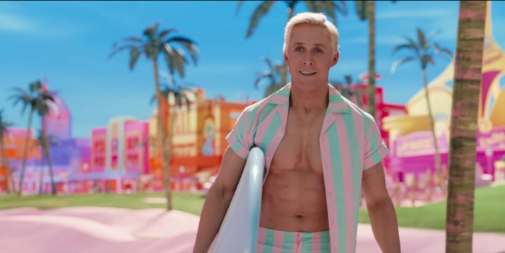 Для Кена пляж — это жизнь. Как уморительно объясняет он в начале фильма, его работа — это пляж, поэтому вполне логично, что он так выглядит, когда мы впервые его видим. На Кене пастельная розово-зеленая полосатая рубашка и такие же шорты. Цветовое сочетание великолепно, а нежные оттенки действительно выделяются на фоне пляжной техноцветовой обстановки. Кажется, что это квинтэссенция Кена, и она идеально подходит для пляжного отдыха. Также очень уместно, что Кен оставляет рубашку расстегнутой, чтобы продемонстрировать свое впечатляющее телосложение — еще одна попытка привлечь внимание Барби.