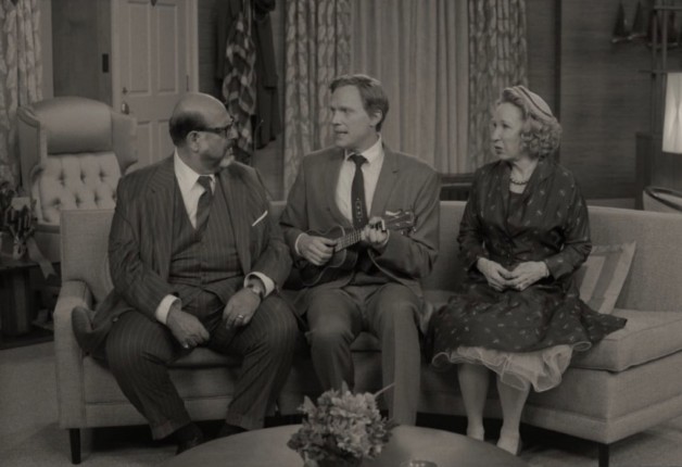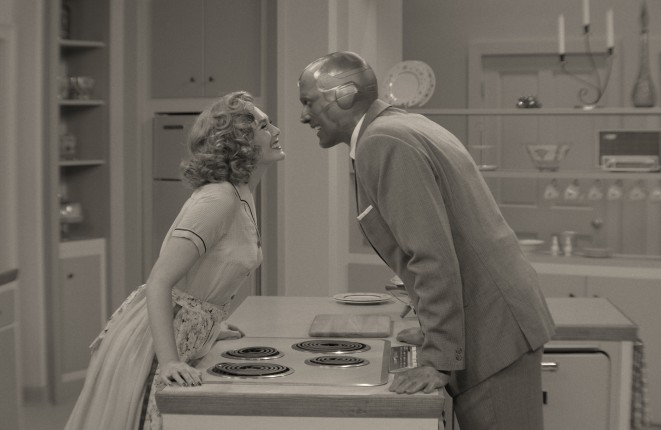 Впрочем, на первом месте у «Ванды и Вижена» — все равно радость от воссоединения с любимыми героями. Этим воодушевлением пропитан каждый кадр и, чувствуется, заражен каждый участник съемочного процесса. Совершенно по-новому перед зрителем раскрылась Элизабет Олсен, с удовольствием прошедшая лагерь подготовки к игре в ситкоме, где ее учили правильно говорить, двигаться и принимать вычурные позы, поскольку комедия в 50-60-е была больше пластической, чем языковой. Пол Беттани тут просто уморителен — этакий гибрид из Дика Ван Дайка, Хью Лори и Тони Старка. Настоящее удовольствие от нового профессионального вызова получили буквально все департаменты — художники по костюмам и декорациям, мэйкаперы, операторы и асы по спецэффектам. Пока первые создавали аутентичные каждой эпохе платья и красили Пола Беттани в синий цвет, который эффектнее смотрится в черно-белой палитре, вторые думали, как органичнее поселить магию в мир ситкома.
